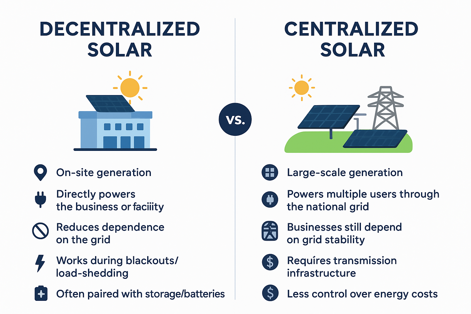 Decentralized systems are particularly useful for businesses in regions with unstable grids, frequent load-shedding, or high electricity costs, as they guarantee a more reliable supply and predictable costs.